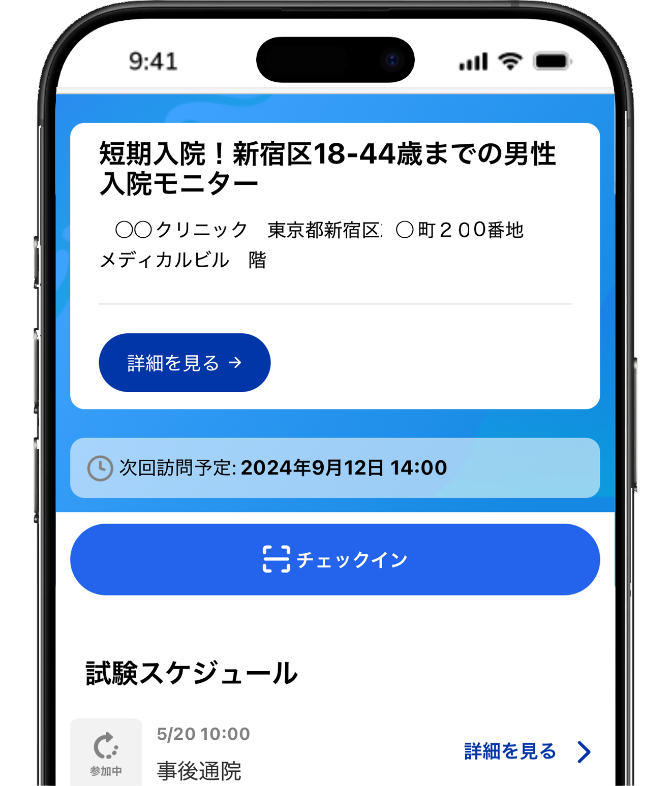 AI&専門スタッフにチャット相談やアプリでチェックインなど、スマートな治験参加体験を。