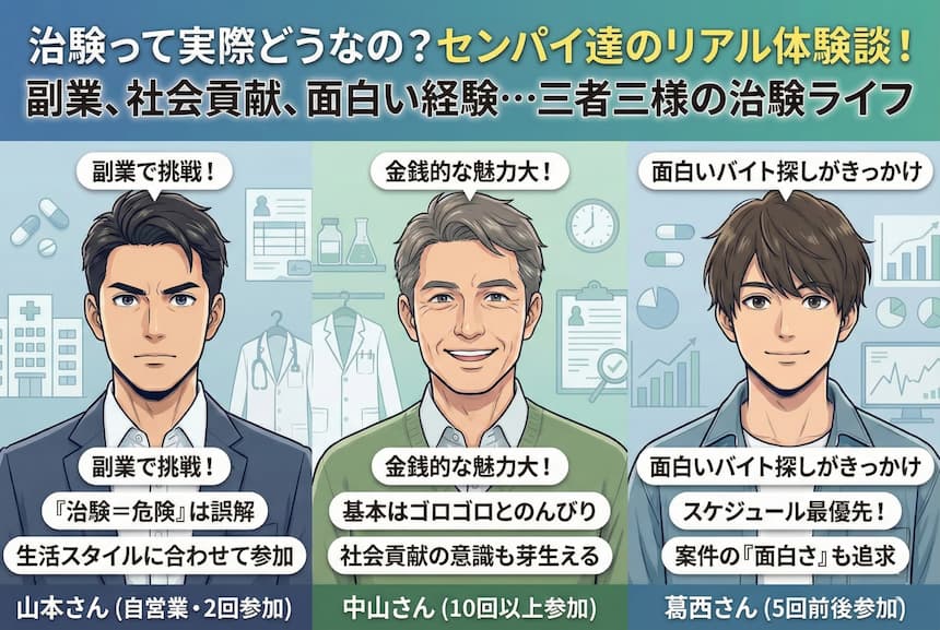 10回以上の治験参加経験を持つ中山さんのリアルな声からは、治験が短期的に収入を得るための手段であるだけでなく、回数を重ねることで「社会貢献」という大きなやりがいも見出せる可能性が伝わってきました。
