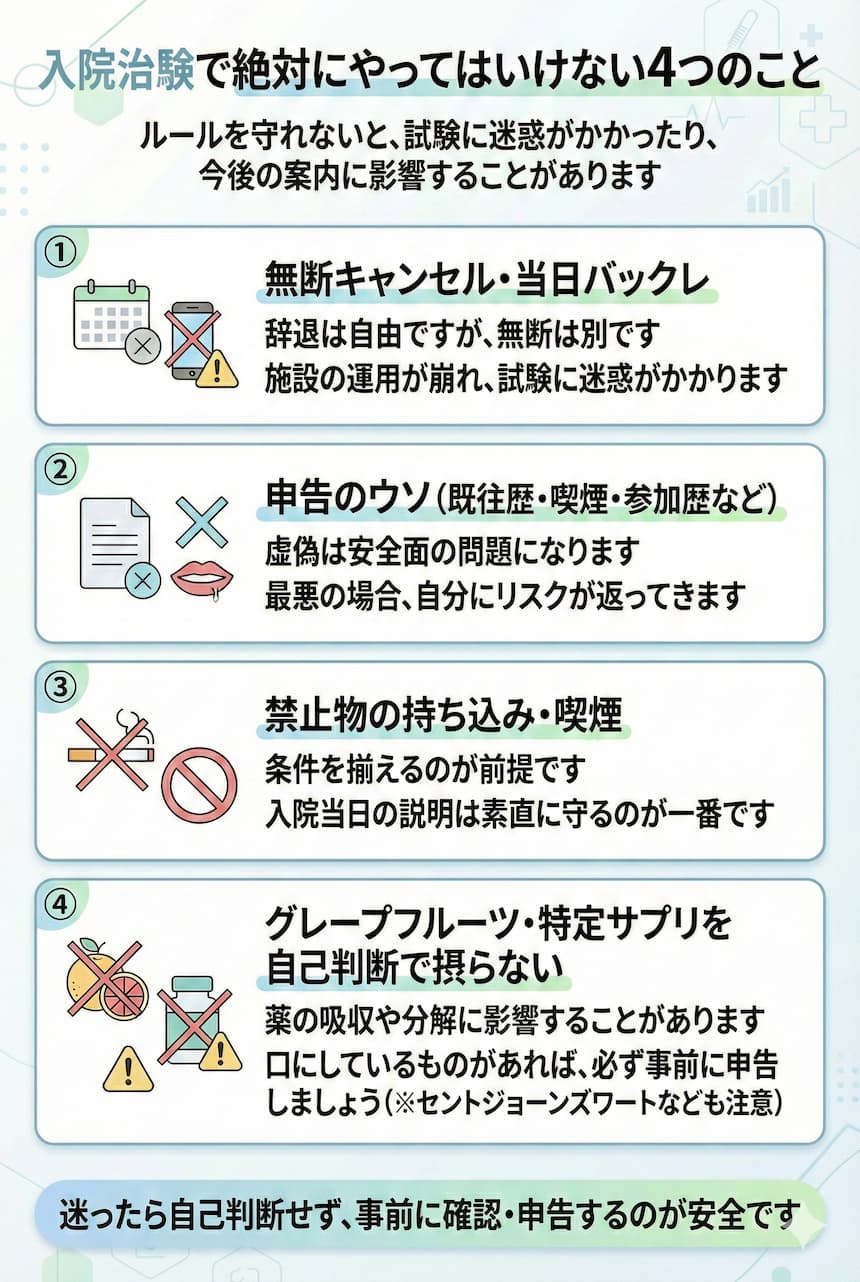 入院治験でやってはいけないことをご紹介します。今後のご案内ができなくなる可能性もありますので、十分に注意してください。